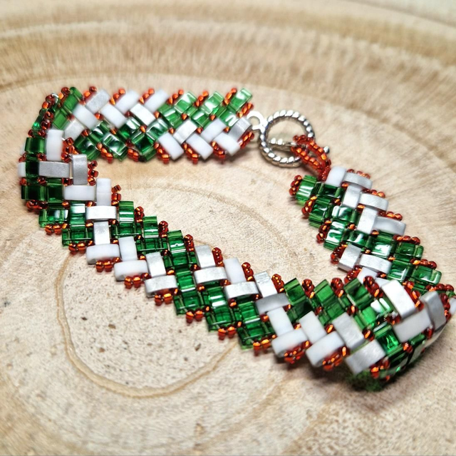 Bracelet en perles half tilas vert et blanc avec des perles de rocailles rouges.